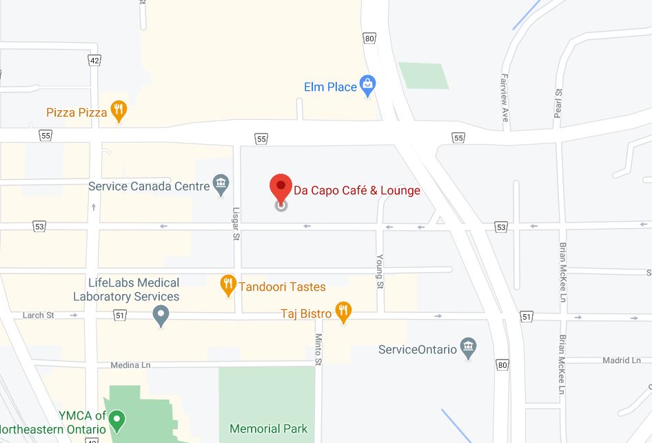 Da Capo Café & Lounge is located in the heart of Sudbury downtown. A warm and European atmosphere welcomes you to blend your senses. Embracing unique flavours, imagery, and sounds, we will travel with you to pristine paths of pleasure. Fresh brewed coffee and homemade Greek desserts accompanied by a variety of refreshments, as well as crepes, deli and a lot more offered to you to enjoy throughout your day.